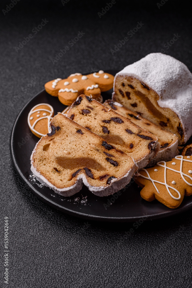 Christmas Stollen, a German sweet cake with marzipan and fruit. Winter Christmas Stollen
