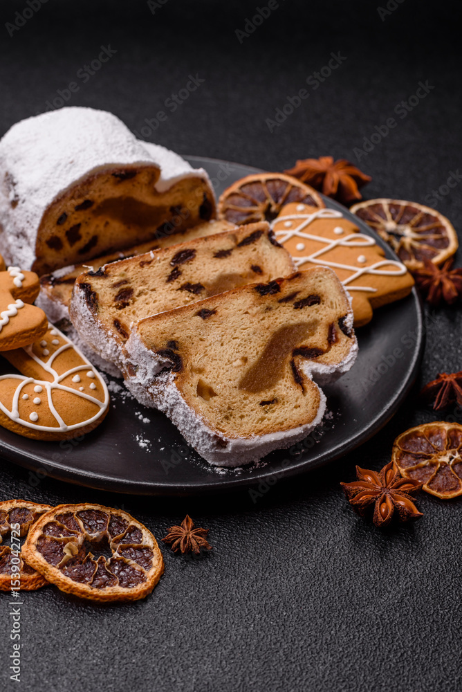 Christmas Stollen, a German sweet cake with marzipan and fruit. Winter Christmas Stollen