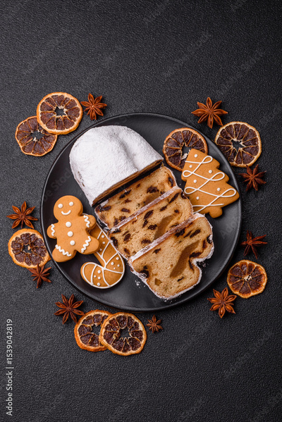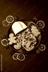 Christmas Stollen, a German sweet cake with marzipan and fruit. Winter Christmas Stollen