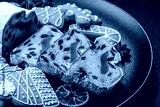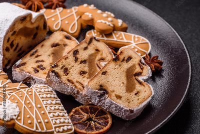 Christmas Stollen, a German sweet cake with marzipan and fruit. Winter Christmas Stollen