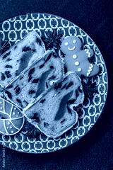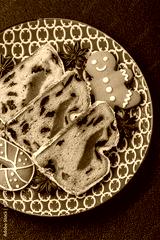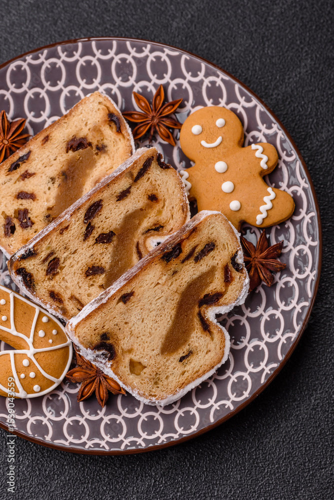 Christmas Stollen, a German sweet cake with marzipan and fruit. Winter Christmas Stollen