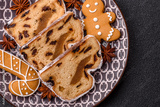 Christmas Stollen, a German sweet cake with marzipan and fruit. Winter Christmas Stollen