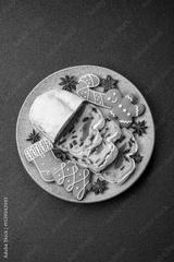 Christmas Stollen, a German sweet cake with marzipan and fruit. Winter Christmas Stollen