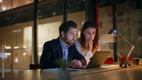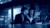 Office winners giving five rejoicing startup success at dark workplace closeup