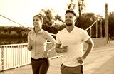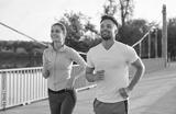 Morning run of happy active couple of runners, woman and man running together outdoor. Healthy cardio training of confident joggers, portrait of jogging athletes in motion. Sport, exercises concept