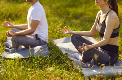 Yogi people couple sitting in lotus pose outdoors on green grass, mudra gesture, meditating, happy calming activity to relax, friends practicing mindfulness in nature, enjoying tranquil setting, peace
