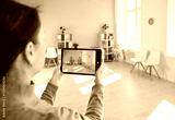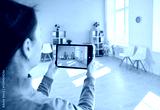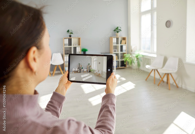 Female realtor or real estate agent takes photo of new home or office for rent or purchase using tablet pc, focusing on property in a professional setting with attention to detail.