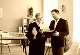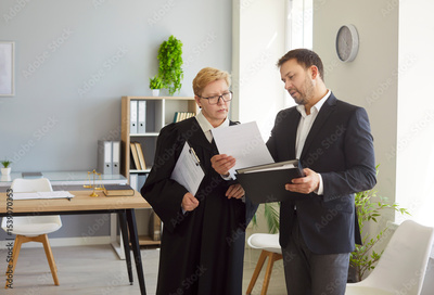 Judge woman in professional outfit black robe and man standing reviewing judiciary documents in court room, examination or discussion of legal judicial settings, lawyer consultation, case preparation
