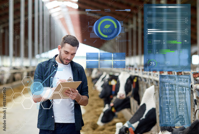 farmer with clipboard and cows in cowshed on farm