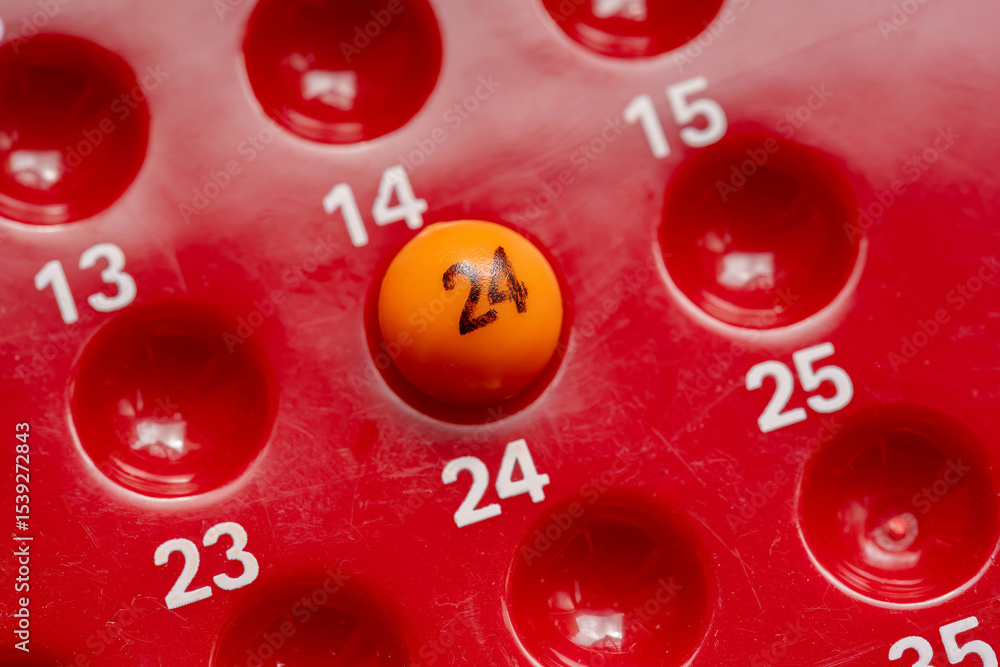 Macro closeup of an orange lottery ball number 24 placed on red bingo game board with numbered slots, concept of luck, chance, random selection, probability and number picking in gaming or gambling