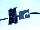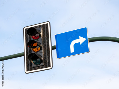 Closeup of an amber traffic light illuminated orange signal next to blue right turn road sign, urban street intersection waiting, caution, driving regulations, laws, transportation direction concept