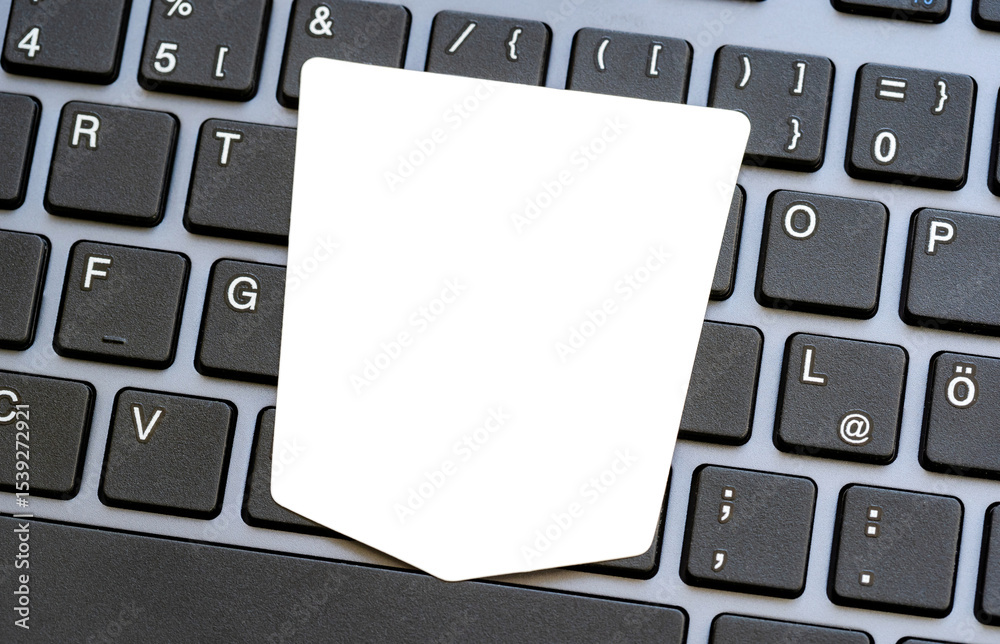 White empty blank cut out shield shaped paper sticker label cutout on modern laptop keyboard cybersecurity data protection safety online security concept information privacy, antivirus mockup template
