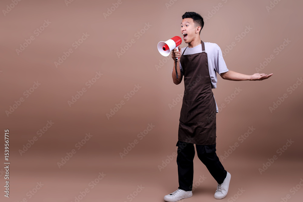 Full Body Of Happy Young Asian Male Wear Brown Apron Speaking Into Megaphone While Presenting