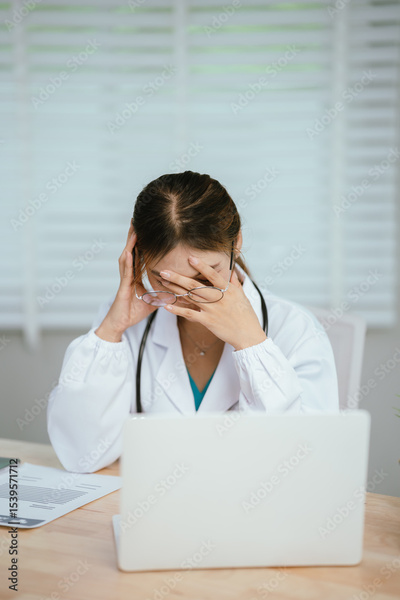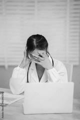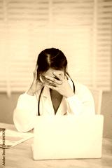 A concerned female doctor in a white lab coat and stethoscope holds her forehead, reading a document at her desk with a laptop.