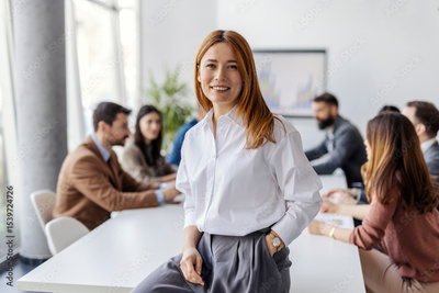 Portrait of businesswoman sitting on table and smiling at camera during seminar.