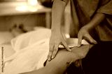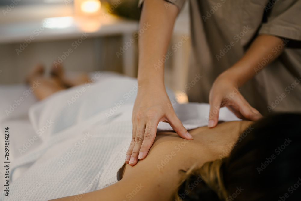 Female client enjoying therapeutic body massage on a treatment table with calm ambiance. Wellness concept
