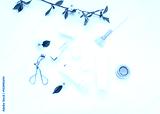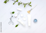 White cosmetics flat lay frame with flowers and leaves. Clean beauty concept
