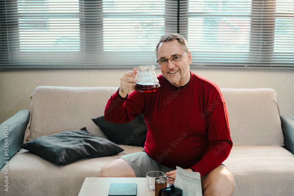 Elderly man enjoying a relaxing morning with a fresh pot of tea at home