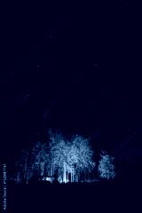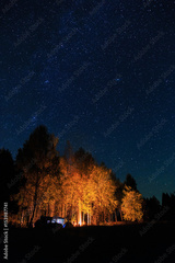 Travelers have a rest in his camp at night near campfire and tent under beautiful night sky full of stars. Recreation and outdoor photo.
