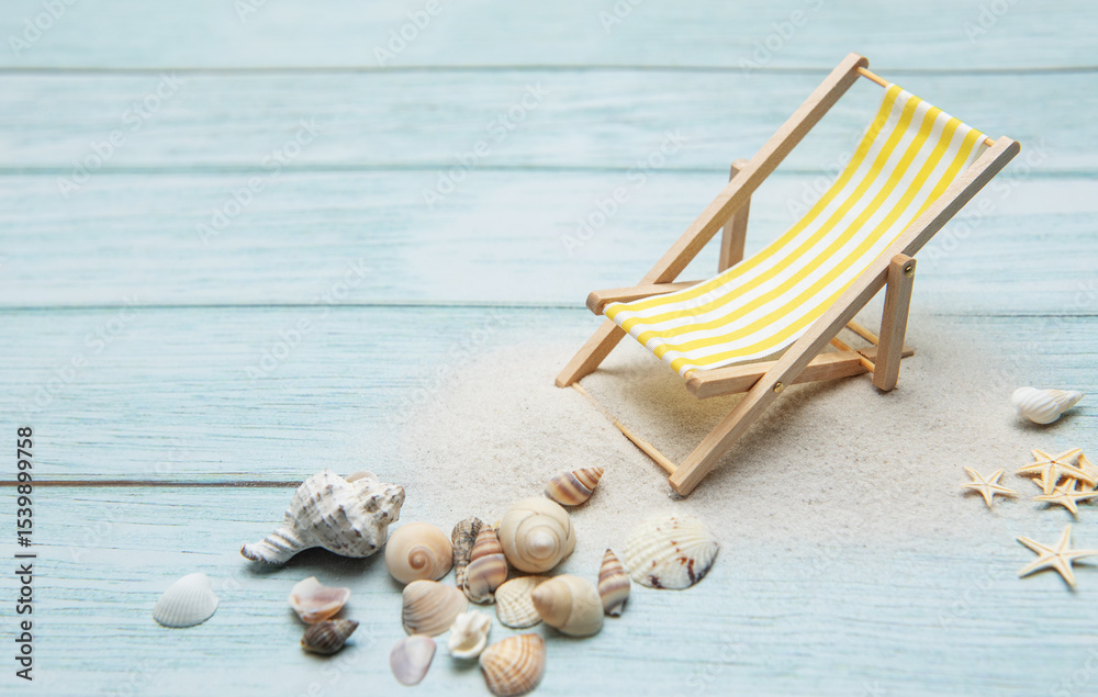 Miniature deck chair on sandy beach with seashells inviting relaxation