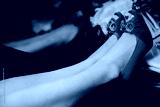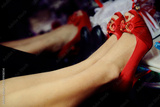 Close-up of legs in red high heels with gold buckles, suggesting a party, celebration, or evening event. Glamorous and elegant footwear on display.