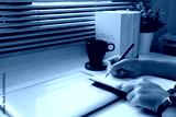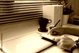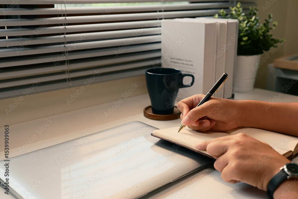 Close up hand writing in a journal beside a closed laptop and potted plant