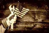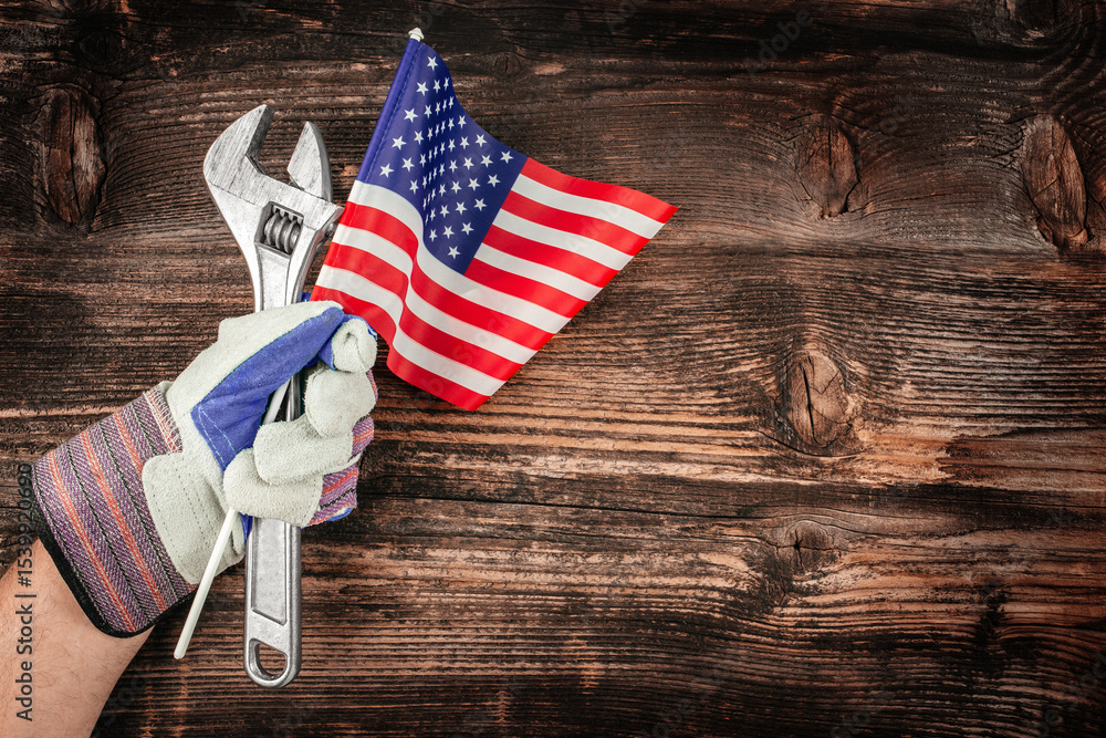 A workers gloved hand proudly holds tools and the American flag against a rustic wood background, symbolizing labor, strength, and national pride