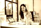 Confident Asian businesswoman smiling while presenting a modern building model in office