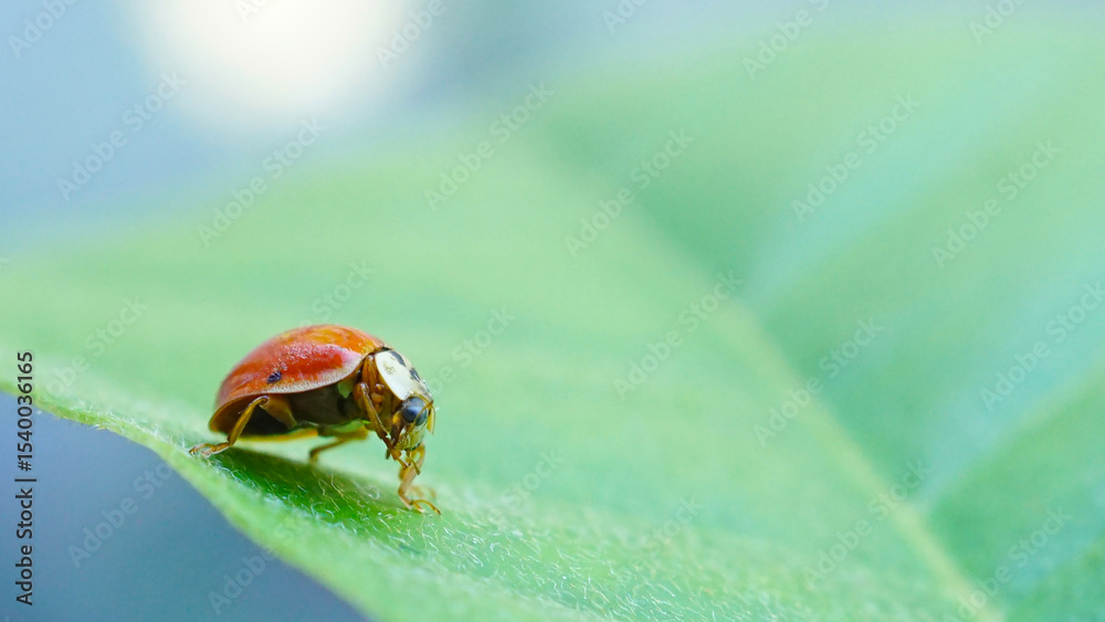 Ladybug cleans its paws on green leaf. Red Ladybird or Coccinella septempunctata