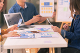 A design team focused on analyzing interface layouts and brainstorming to improve the user experience in a mobile responsive workshop with UI/UX Front End Designer Previewing.