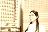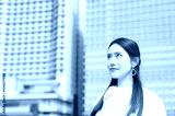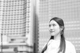 高層ビルを背景に一点を見つめる女性の真剣な表情の屋外ポートレート