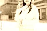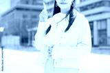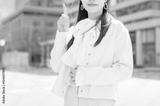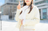 道路沿いに立ち白いジャケットで指を二本立てる女性のかわいらしい仕草
