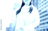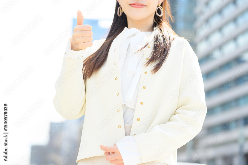 白いジャケットの女性が親指を立てて笑顔を見せる都会の明るい日差しの中