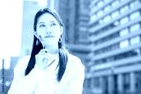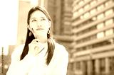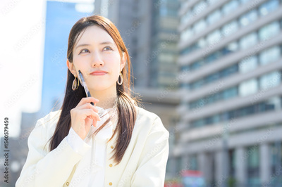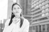 晴れた街角で顎に指をあてながら真剣な眼差しを向ける白トップスの女性