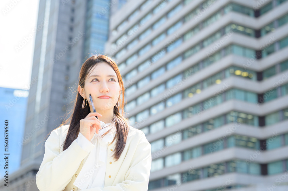 ビジネス街の中で遠くを見つめるように考える白ジャケットの女性が印象的な朝