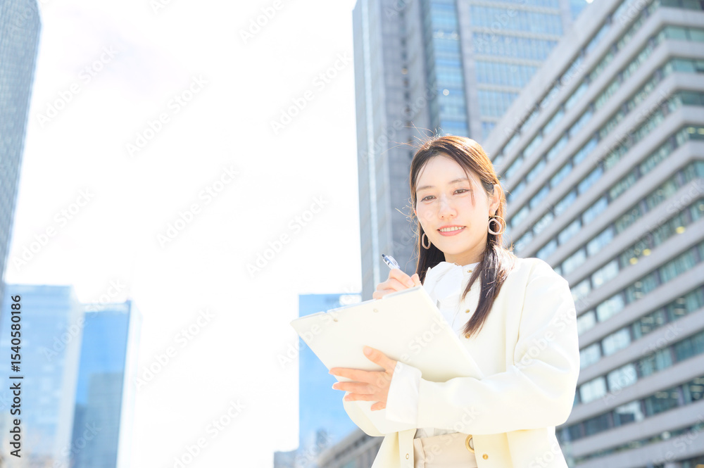 資料を持ちながら街角で柔らかくほほ笑む白ジャケット姿の女性のビジネスポートレート
