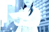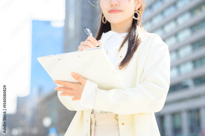 白い服の女性が資料にペンを走らせながら街中で立ち止まり思考する姿