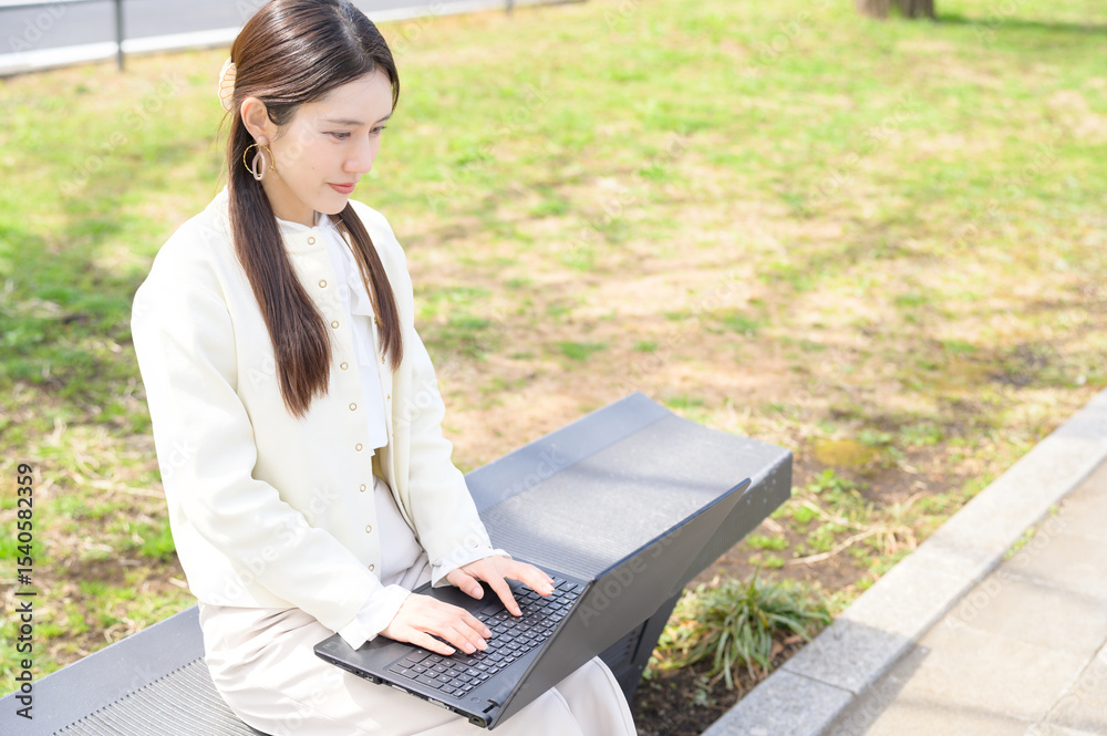 屋外のベンチでノートパソコンに集中する白いジャケットの女性が春の陽射しを浴びる