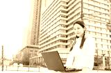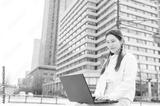 晴れた日差しの中でノートパソコンに向かう白ジャケットの女性が業務に集中