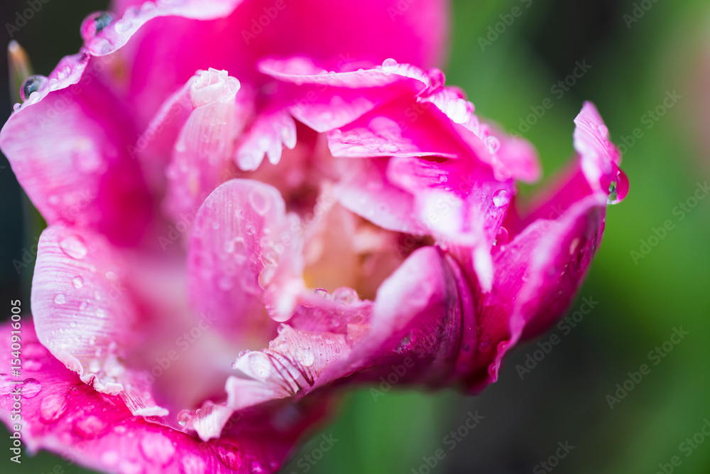 Macro photo of a vibrant pink tulip embellished with water droplets