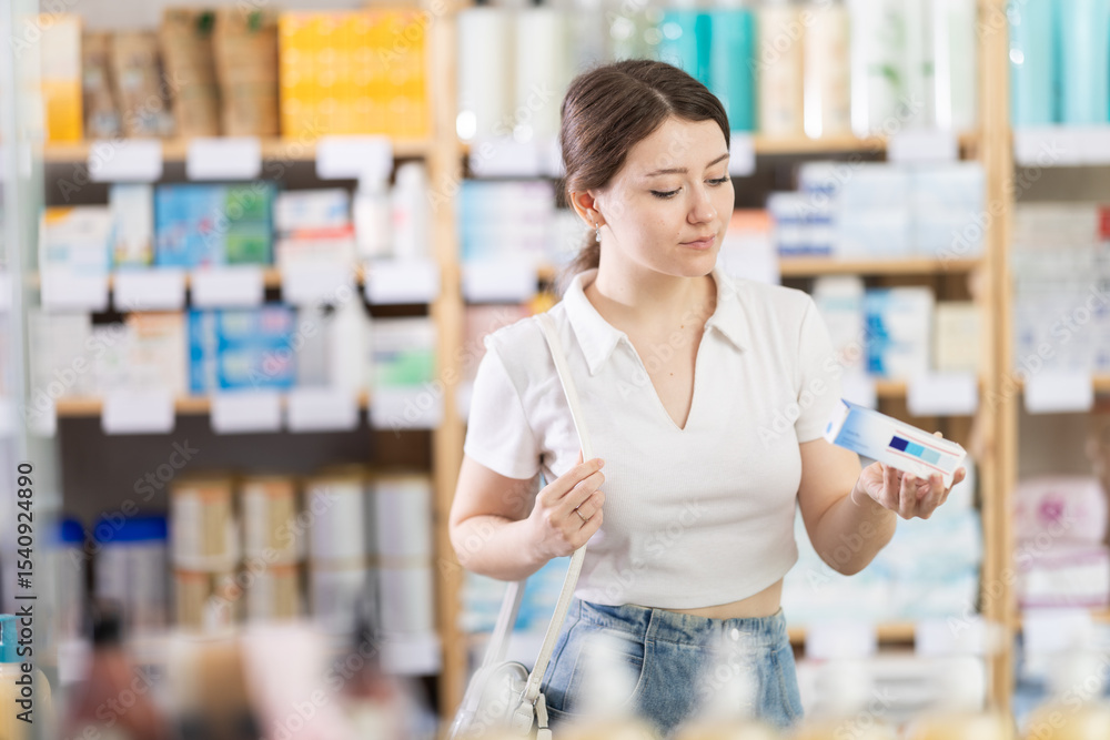 Calm and focused young female customer examining therapeutic ointment box in pharmacy, checking instructions before using for minor wounds or burns..