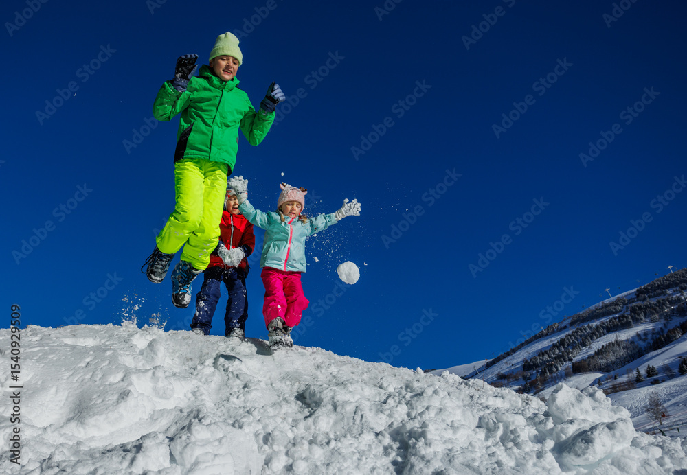 Kids joyfully jumping on a snowy hill, enjoy winter vacations