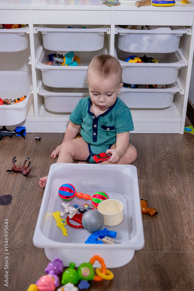 A small baby is happily playing with colorful toys in a white bin