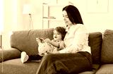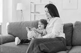 Mother and son, nanny woman sitting together on couch, interacting with yellow piggy bank, learning saving money, inserting development of memory, attention, baby sitter helping in study at home