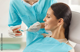 Stomatologist doctor, orthodontist dental model demonstration, patient woman clinic oral health treatment, dentist exam, teeth, gum care, doctor visit, whitening teeth procedure, stomatology clinic