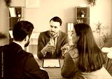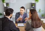 Male financial advisor consulting a young confident couple about insurance sitting at the desk in office. Man and woman talking with realtor or business broker going to sign a contract.