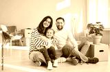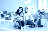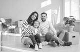 Happy family of three members enjoying Moving Day, relocate to new apartment, sitting on floor in empty apartment with empty cardboard boxes. Mortgage, home buying and relocation concept