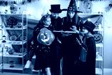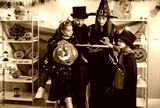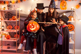 Family with children celebrates a halloween party at home, reading a book together in costumes. Festive atmosphere includes themed decorations and a cozy moment of shared storytelling.