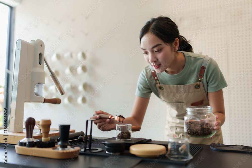 Barista weighing coffee beans for perfect espresso preparation in modern cafe