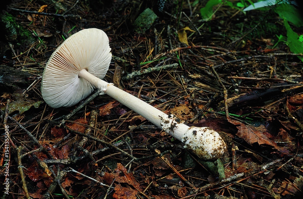 Close-up of Grisette Amanita mushroom (Amanita vaginata group) growing on forest floor in Korea. Potentially dangerous due to high risk of confusion with deadly Amanita species.
